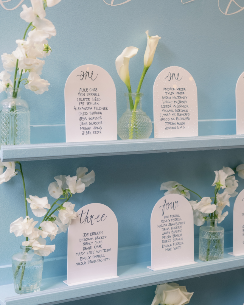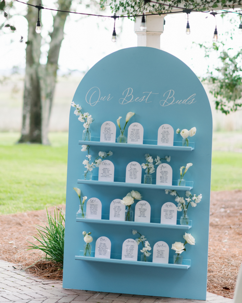 The reception was equally breathtaking. A stunning tented space at HollyOaks featured a grand floral chandelier of white and blue hydrangeas and calla lilies floating above the dance floor, creating a romantic focal point for the evening. Guests mingled between classic farm tables and chic lounge areas, striking the perfect balance between elegance and comfort. Thoughtful details, like the personalized “Our Best Buds” floral seating chart, added charm and personality throughout the space.