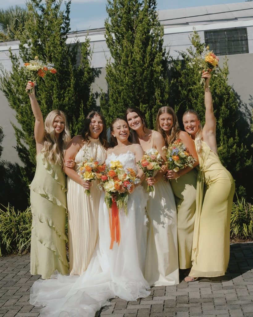 Emilie looked stunning in a flowing tulle gown with delicate lace floral detailing, while her bridesmaids wore mismatched dresses in soft yellow and light green hues, creating texture and movement that felt effortless. Every element came together beautifully thanks to Elegant Savannah Weddings, whose thoughtful planning brought the couple’s vision to life seamlessly!
