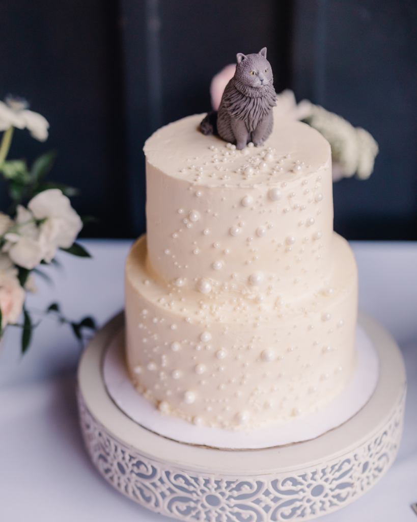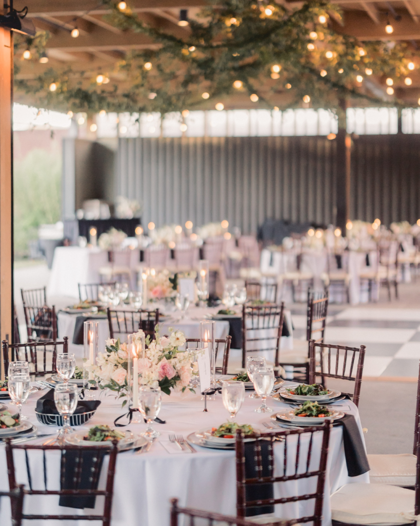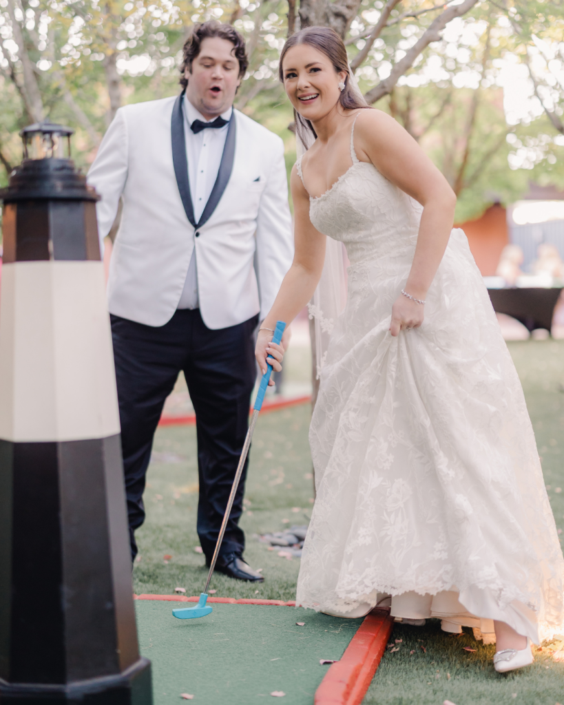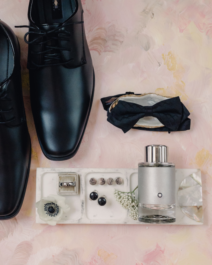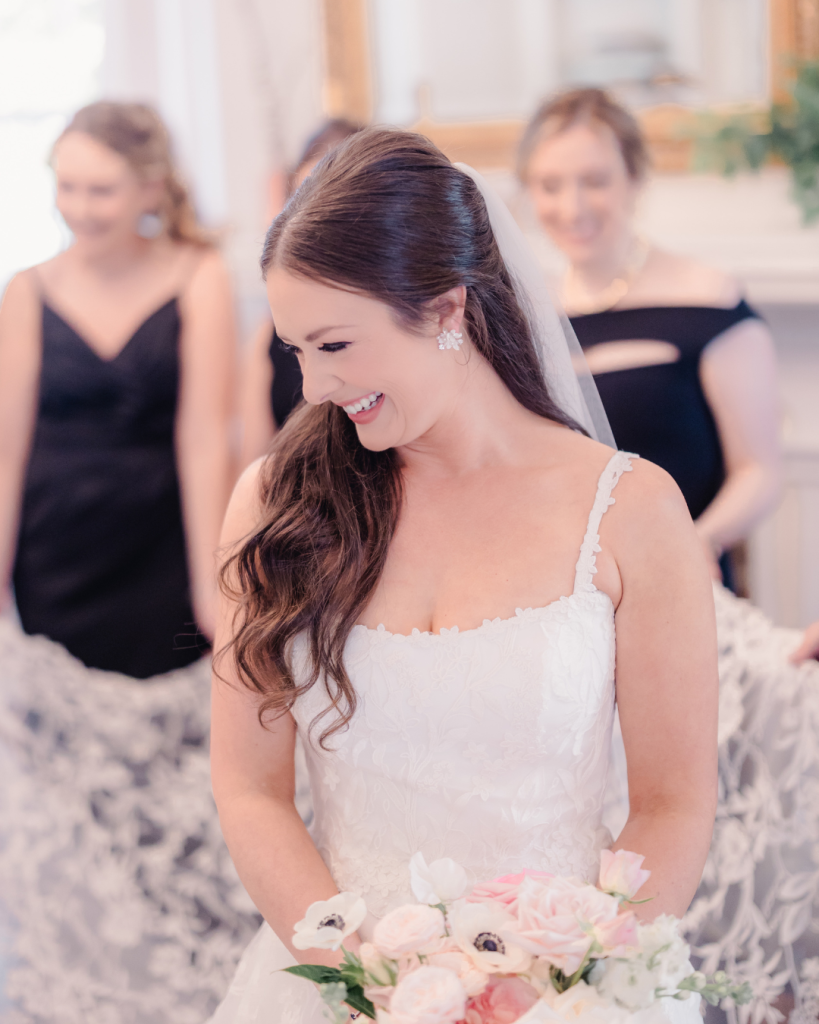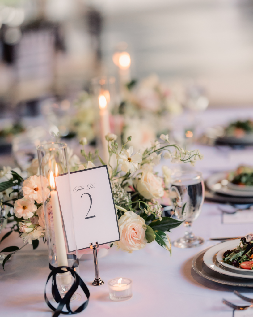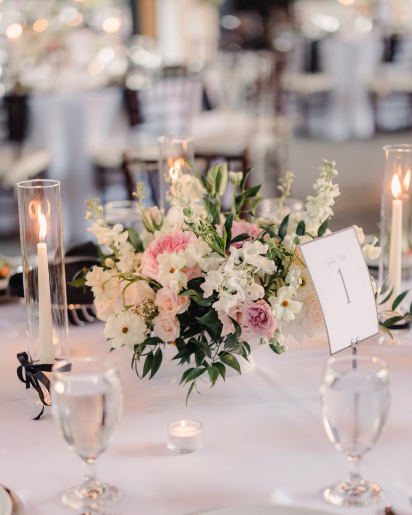 The couple’s color palette featured soft pinks and whites layered with elegant greenery, creating a fresh and romantic atmosphere that complemented the venue’s stately Scarbrough House and expansive gardens. Lena was stunning in a lace-detailed gown, complete with an elegant veil featuring delicate floral lace edging that framed her look perfectly. Terry made a striking statement in a white tux paired with black pants, while the wedding party, dressed in classic black, added a modern contrast to the soft floral design.