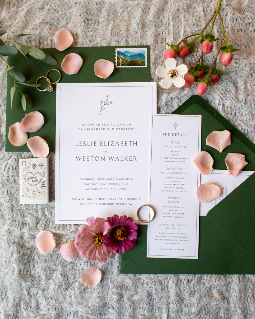 Leslie and Weston celebrated their September wedding with an intimate ceremony tucked inside the enchanting garden courtyard of The Forsyth Park Inn. Beneath the lush greenery and Savannah’s iconic charm, the couple exchanged heartfelt vows, surrounded by just their closest loved ones. Their day blended elegance with a vibrant, joyful color palette… perfect for a fall celebration in the heart of Savannah!