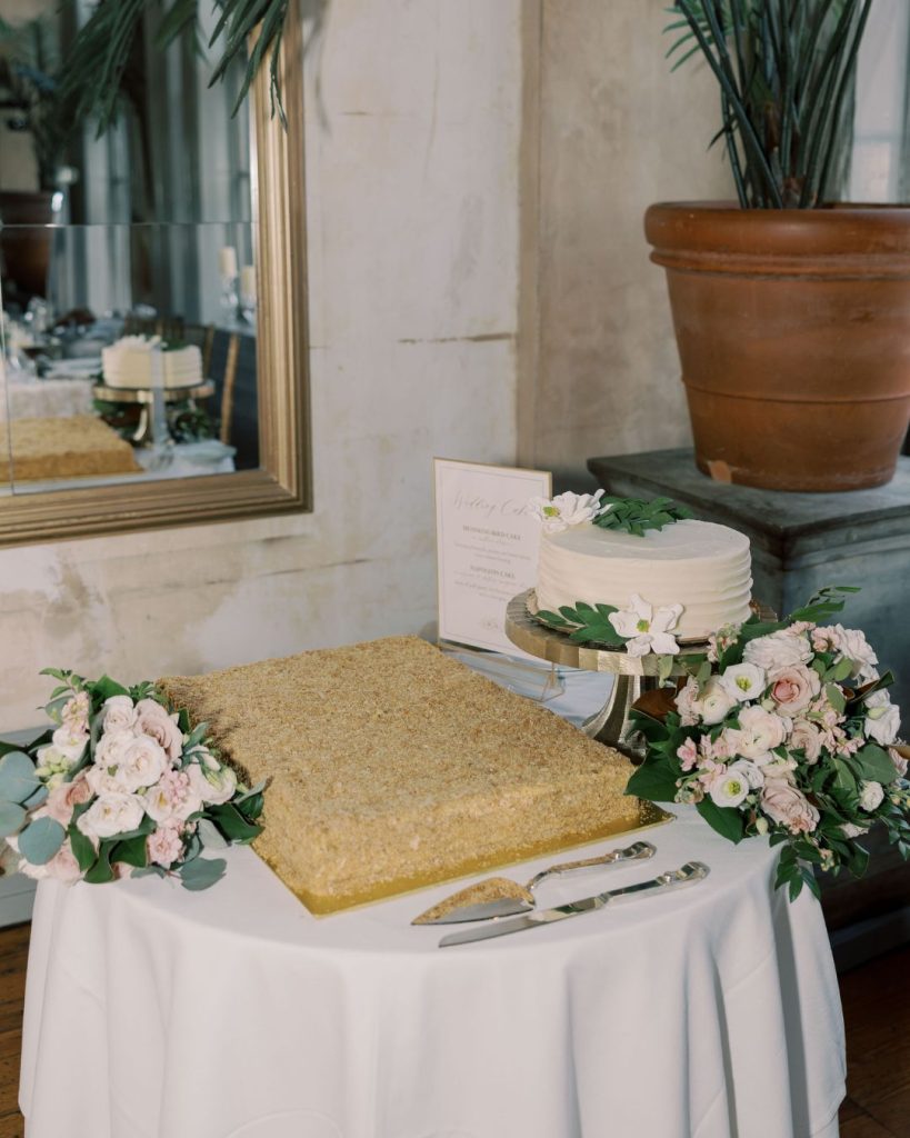 After the ceremony, guests gathered at Garibaldi restaurant for an elegant reception filled with love, laughter, and family traditions. One highlight was the dessert table, featuring two meaningful cakes. To honor Dave’s Russian roots, the couple served a traditional Napoleon cake; a delicate, layered dessert made possible thanks to Katie of Auspicious Baking Co. Alongside it was a Southern classic, hummingbird cake, a nod to the wedding’s Savannah setting.