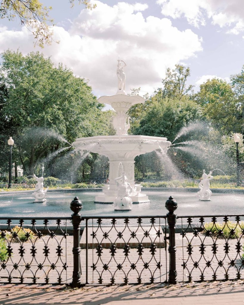 The ceremony took place at one of Savannah’s most iconic backdrops, the fountain at Forsyth Park. Officiated by the groom’s cousin, the heartfelt exchange of vows honored the couple’s love story in a setting as timeless as it was romantic.