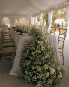 Table designs are becoming immersive, flowing from one end of the reception space to the other with organic, garden-style arrangements. These designs often spill naturally across linens, wrap around candles, and blend seamlessly with place settings.