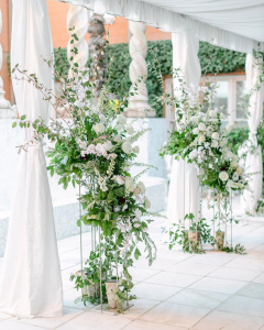 Think tall floral moments—risers, chandeliers, towering centerpieces, and vertical sculptural elements that add height and drama. Elevated installations draw the eye upward and provide gorgeous structure to a room.