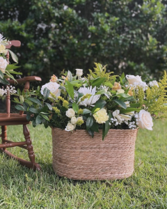 Rattan, wicker, or woven baskets filled with florals are popping up at ceremonies, lounge vignettes, and reception entrances. They add a warm, romantic, and slightly vintage touch.