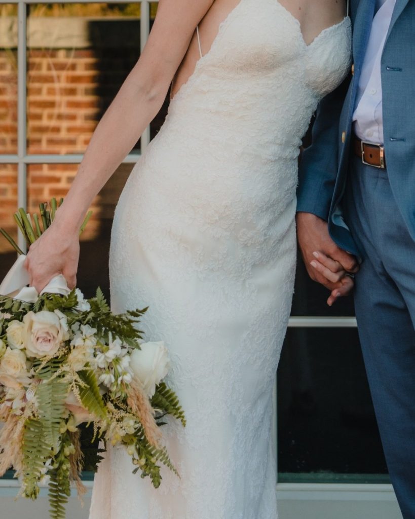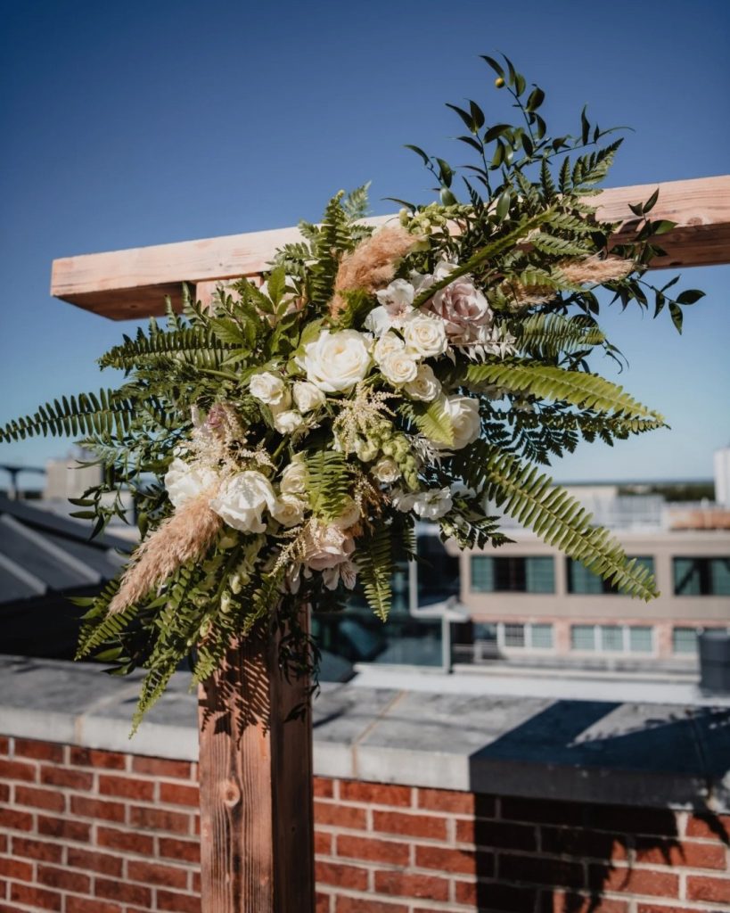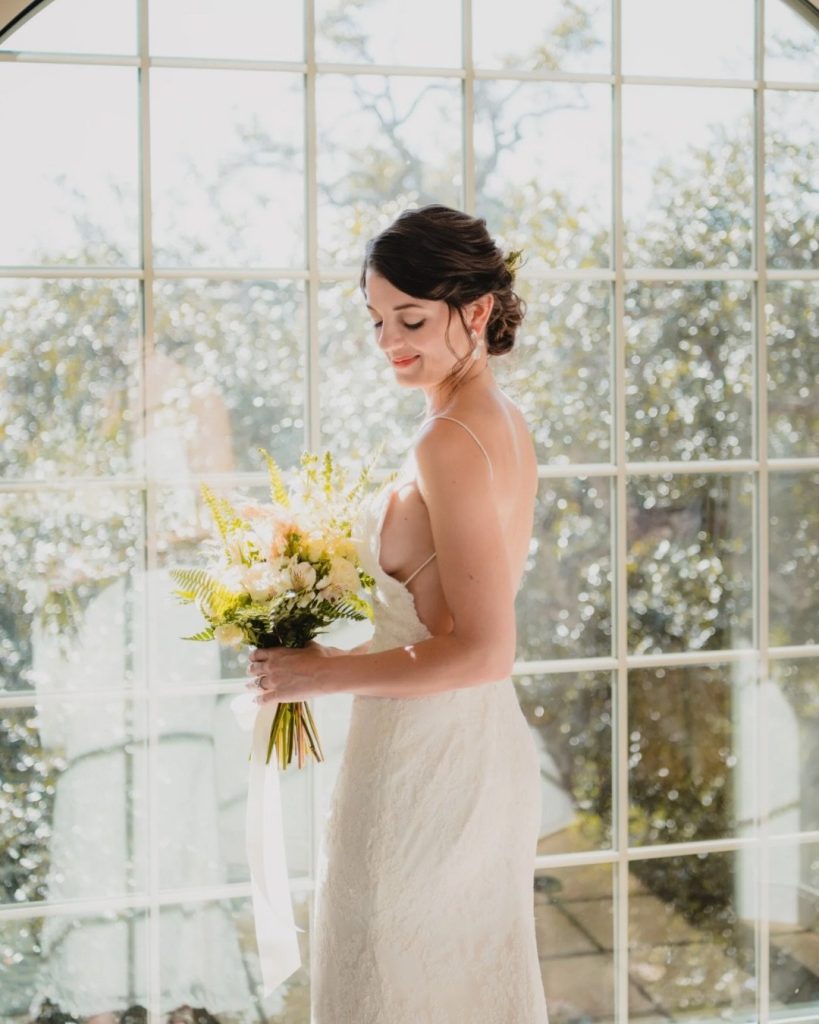 Their ceremony featured a wooden arch accented with a simple yet beautiful floral arrangement, creating a clean and classic focal point. Set against Savannah’s natural surroundings, the design felt elevated without being overdone.