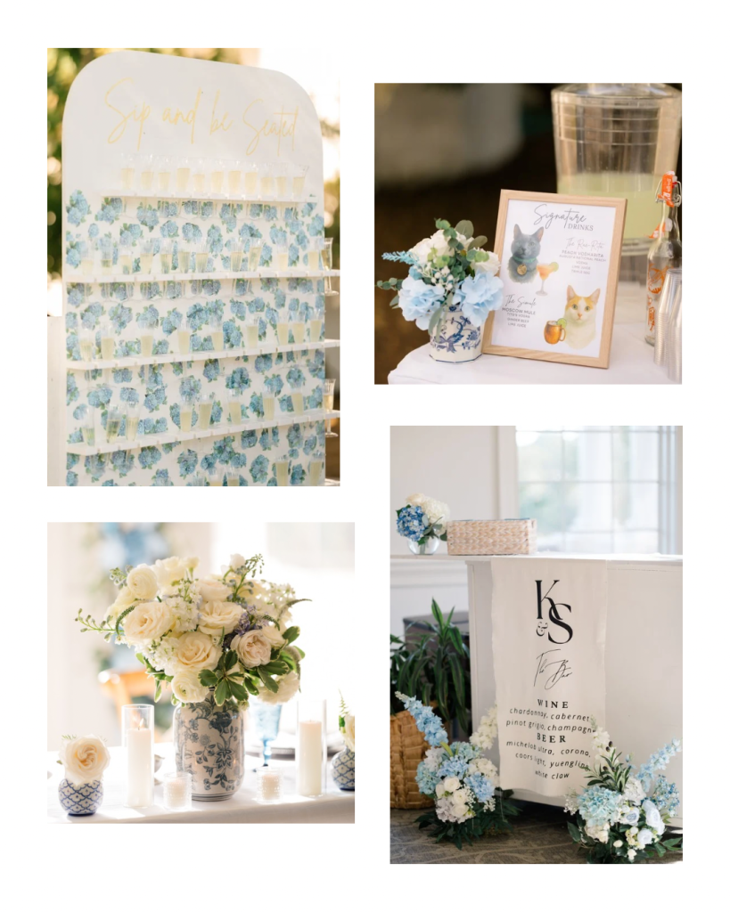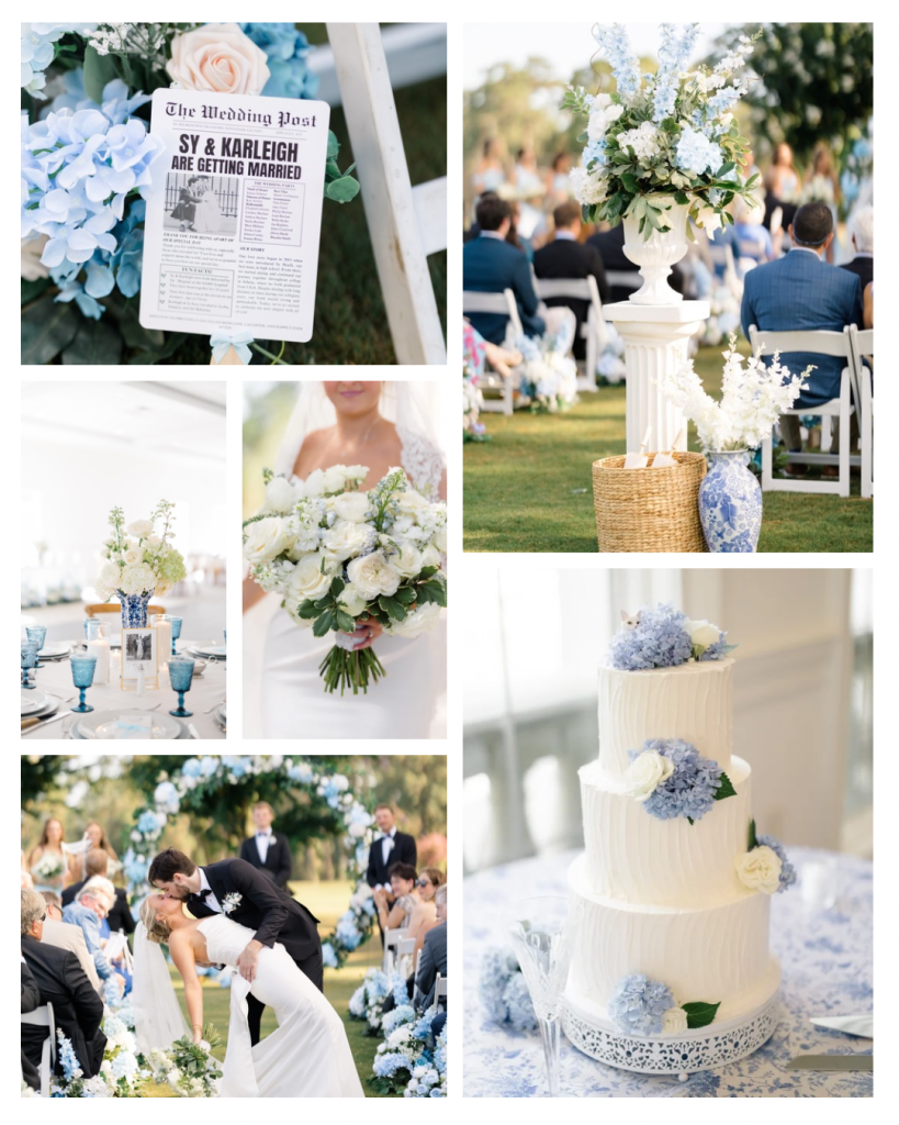 Florals were a standout feature, with white blooms accented by soft blue touches arranged in vases and centerpieces created by the bride’s aunt, Susan Upton. The shades of blue throughout the decor complemented the wedding’s soft coastal theme, bringing a serene and elegant palette to the summer celebration.