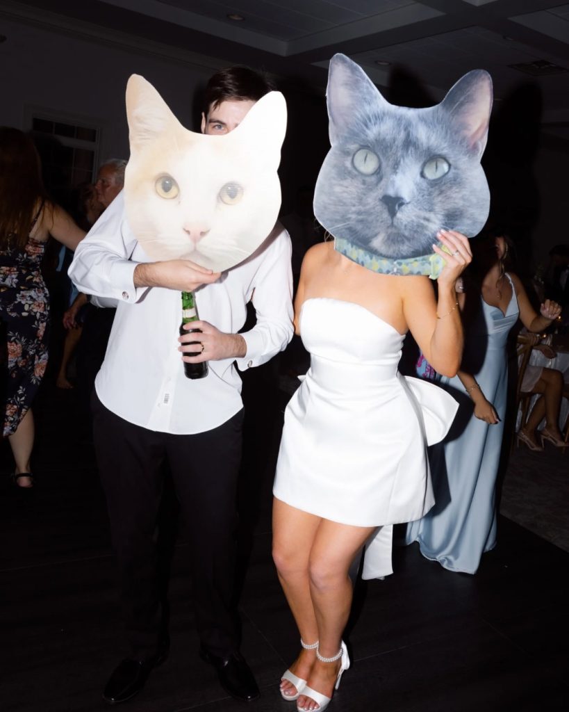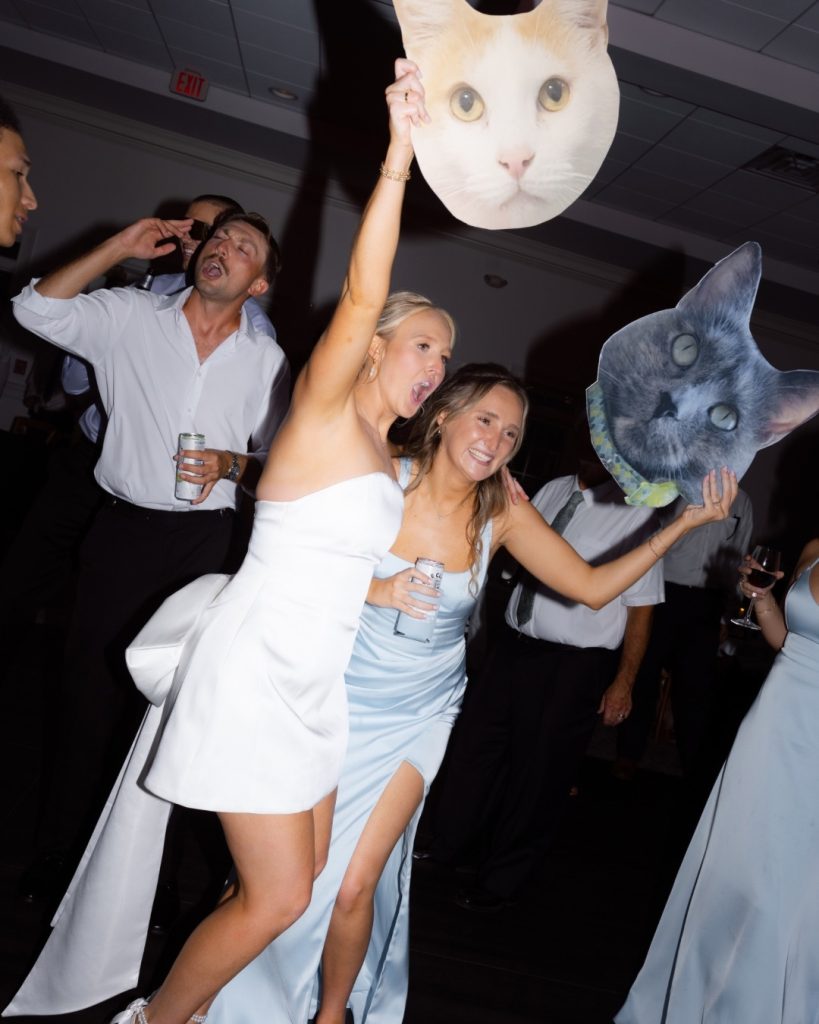 The couple’s commitment to meaningful details was evident in every corner of the day. Sy’s father built a stunning champagne wall, while Karleigh’s dad handcrafted all of the signage — adding an intimate, handcrafted feel to the celebration. Their love for cats played a playful role as well, inspiring signature cocktails, cake toppers, and even oversized cat heads on the dance floor.