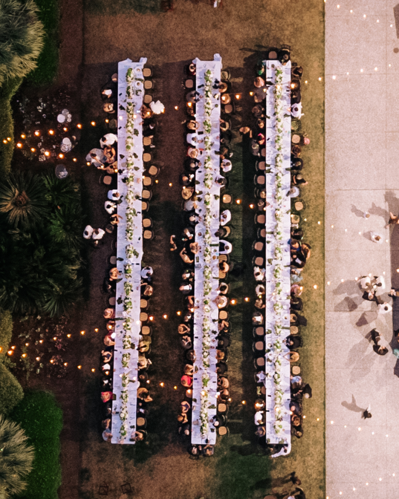 And that philosophy guided the entire aesthetic. Working alongside Posey Event Design, they rented specialty estate tables, three long reception tables — a nod to family-style dinners in Greece — inviting loved ones to gather closely. “It reminded me of dinners back in Greece, long tables, good food, and everyone gathered together,” bride Annie shared.