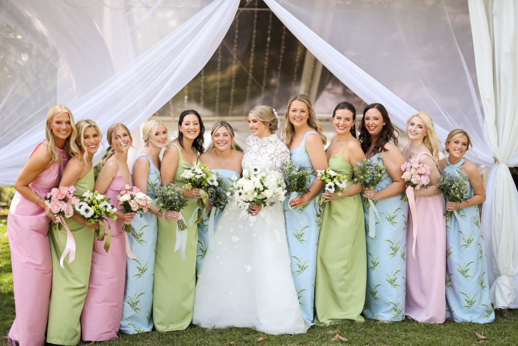 Harvey Designs elevated the celebration with lush arrangements in soft pinks, crisp whites, and delicate hints of blue, perfectly complementing the bridesmaids’ colorful dresses. The florals were thoughtfully placed throughout the venue, weaving the day’s vibrant palette into every corner and creating a cohesive, elegant aesthetic.